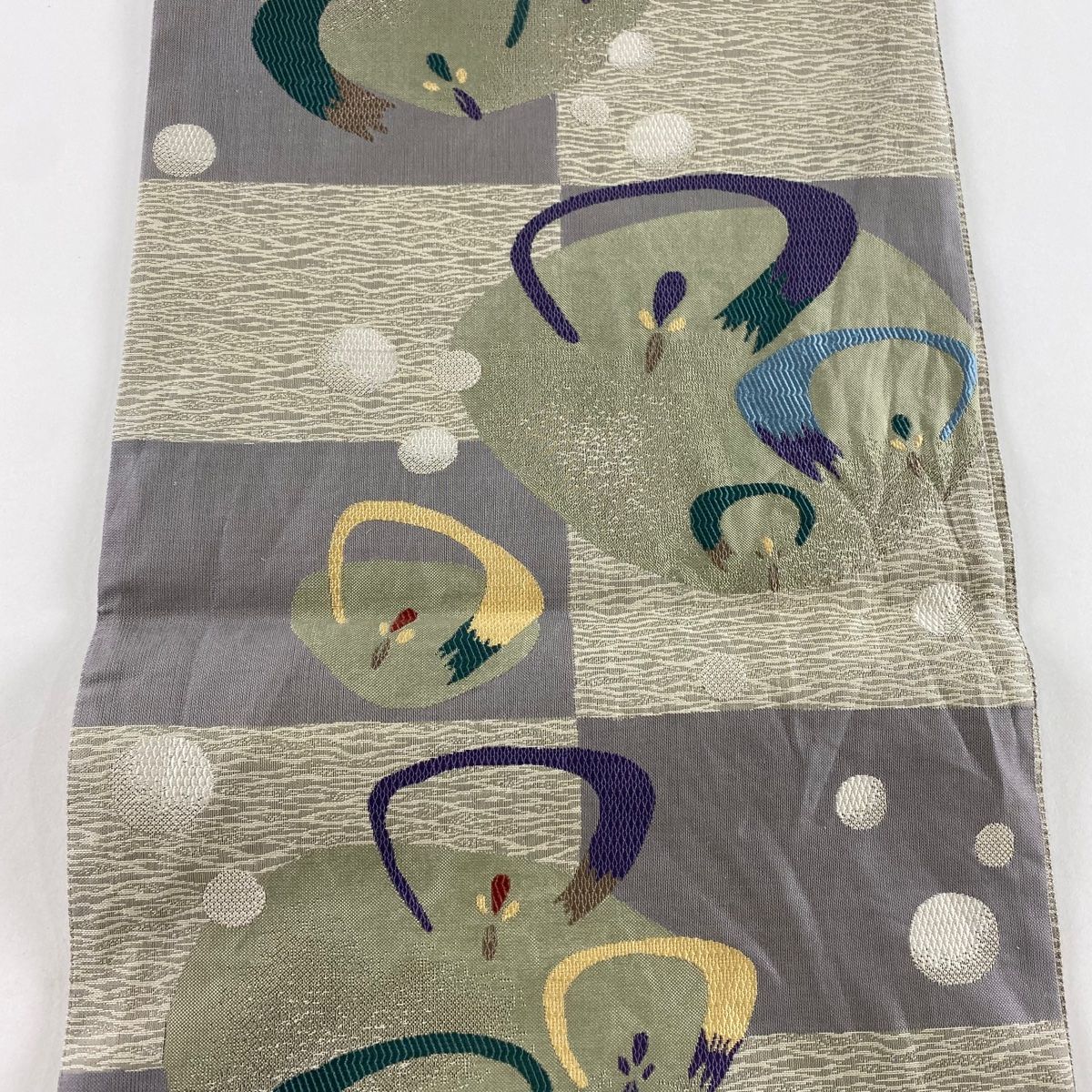 袋帯 秀品 変わり市松 幾何学模様 箔 灰緑 六通 正絹