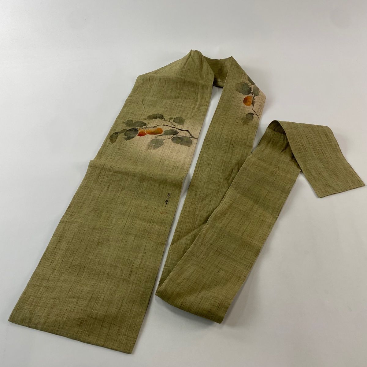 名古屋帯 秀品 落款 夏帯 柿 抹茶色 麻