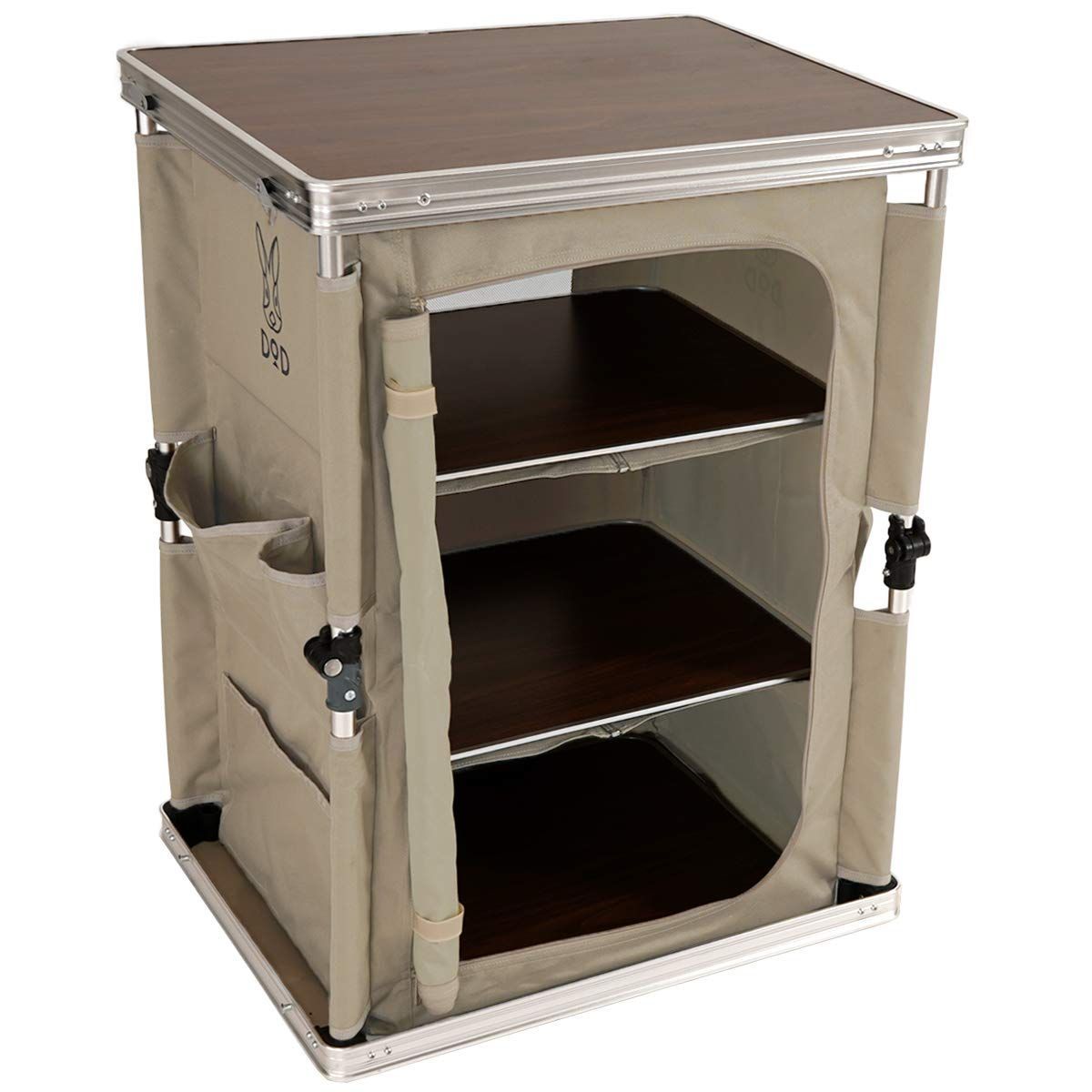 大容量な3段の棚はギアや調理道具を収納することができ、キャンプキッチンの整理整頓に役立ちます。