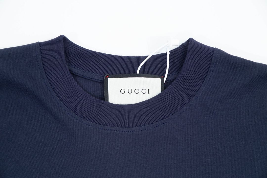 この GUCCI の T シャツは、男女兼用のカップルデザインでレラックスフォーム。240g の厚手綿毛圈生地を使用し、市場品とは明確に差別化する頂級素材です。刺繍部分は精密なローマアルファベットを採用し、専用特殊機械で 1 本針での縫製を徹底追求。生地の色差を完全解消するため、厳選染料で定染処理を施しています。