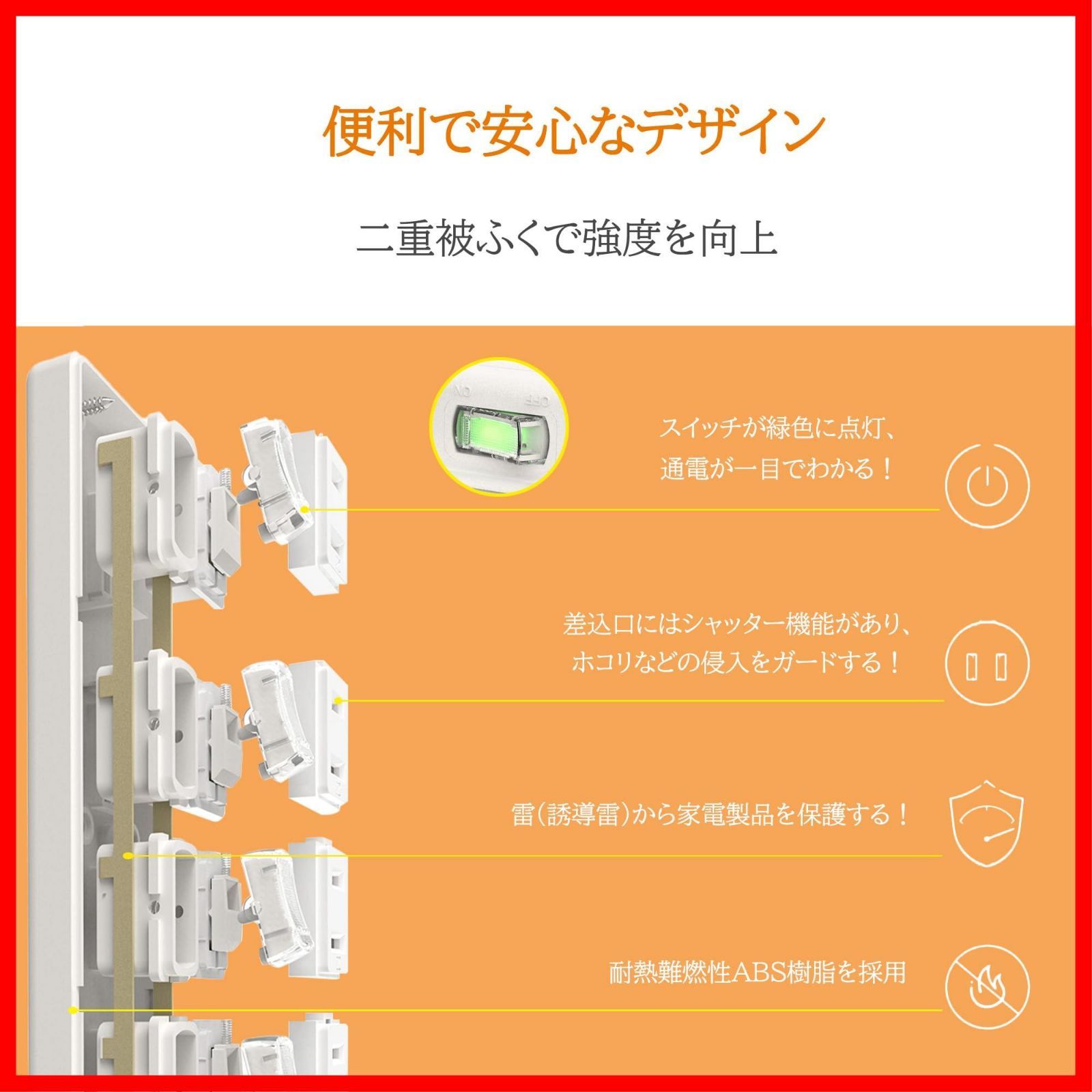 【事故予防、感電防止対策済】ホコリ防止シャッターにより、使用しないコンセントへのホコリの侵入を防ぎ、火事などの事故予防に効果的です。トラッキング火災予防に効果的な絶縁キャップ付きプラグです。トラッキング現象による火災防止に役立ちます。 絶縁V-0規格PC素材を採用し、万一発熱した場合でも融解しにくい設計です。 洗練された回路設計および高品質の銅線を採用、過熱、過電流、過負荷、過充電からお使いの家電を守ります。テレビやパソコンなどの精密機器を雷から守る。高性能雷サージ吸収素子内蔵、安全性と使い勝手に配慮した雷ガードタップ。 雷サージから電子機器を守る、高性能雷サージ吸収素子を内蔵した、雷ガードタップです。