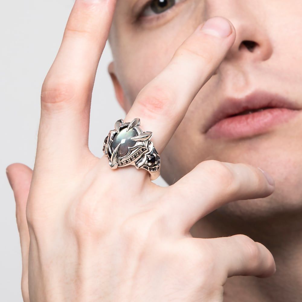 A sheet of labradorite shimmers with an ethereal play-of-color—cool blues, verdant greens, and flashes of violet that shift with every angle. Grasping that mysterious light, the dragon’s talons bring a sculptural sense of strength and guardianship to the hand. Along the shoulders, intricate tracery is carved in relief, catching light and shadow to create refined depth. More than an accessory, this ring wears like a modern objet—an enduring marker of personal style. Each stone is carefully selected and individually set, then finished by master artisans for a crisp silhouette and a luxuriously smooth feel. Nature’s one-of-a-kind color and meticulous craft unite to amplify the wearer’s character with quiet power.