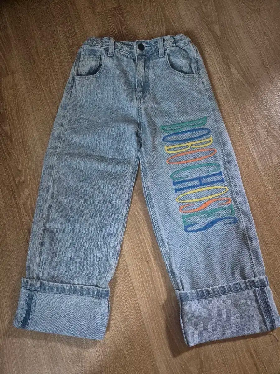 ボボショーズ 刺繍 デニム ズボン 6-7歳用。ロールアップ スタイルで 可愛く演出可能。デニム カラーも綺麗で、横に 刺繍 ロゴが POINT。コメント 無ければ すぐ 安全決済してください!