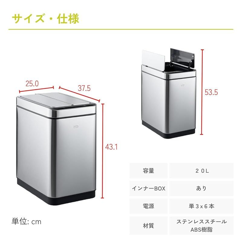 アクティブセンサーを搭載し手のひら程度の高さのみ作動します。中箱に袋を装着し20Lの容積でご使用できます。丸洗いできるので衛生的です。