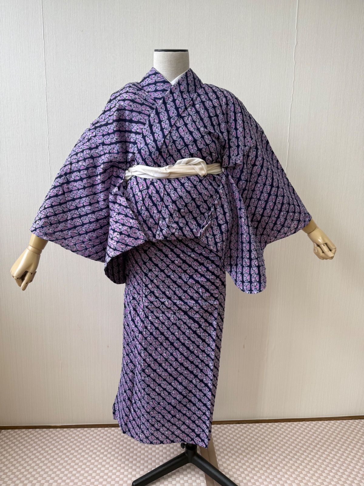 絞りの浴衣ですので、シボ感がありあまり肌に張り付かず、比較的涼しくお召しいただけます。