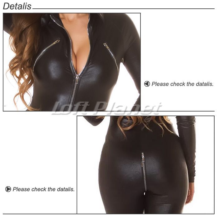 キャットスーツ ジッパー クロッチオープン 3スライダー レザー調 ストレッチ ボンテージ セクシーコスチューム 黒 T 1