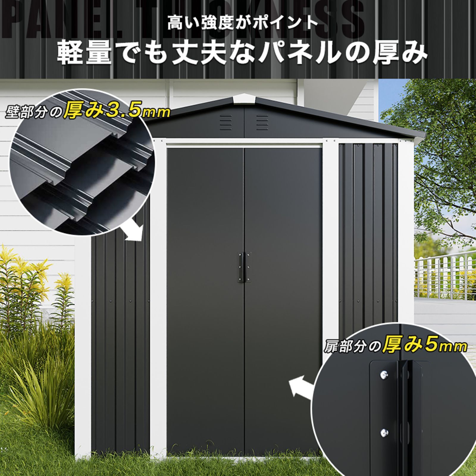 軽いのに耐久性抜群のガルバリウム鋼板を採用。(フレームとドアの厚み0.5mm、パネルの厚み0.35mm)。キズがつきにくいパウダーコート塗装は、耐候性や防錆性にも優れており、耐用年数が長いのが特徴。切妻屋根は雨漏りを起こしにくいだけでなく、傾斜で雨水が溜まりにくいので防食効果があります。