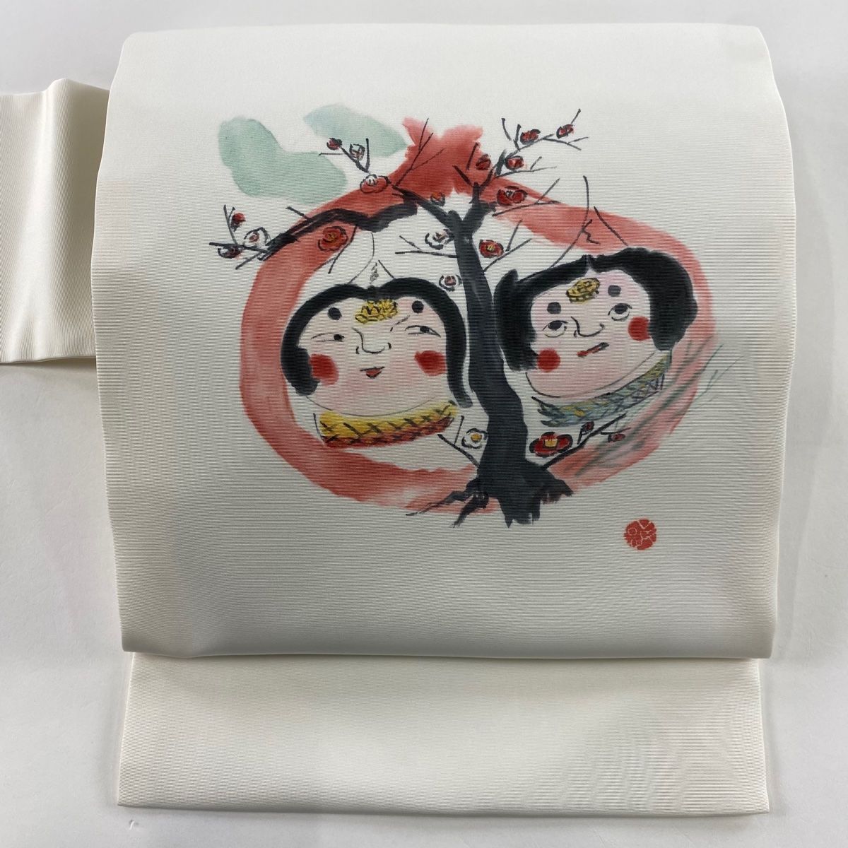 名古屋帯 秀品 落款 人物 樹木 白 正絹