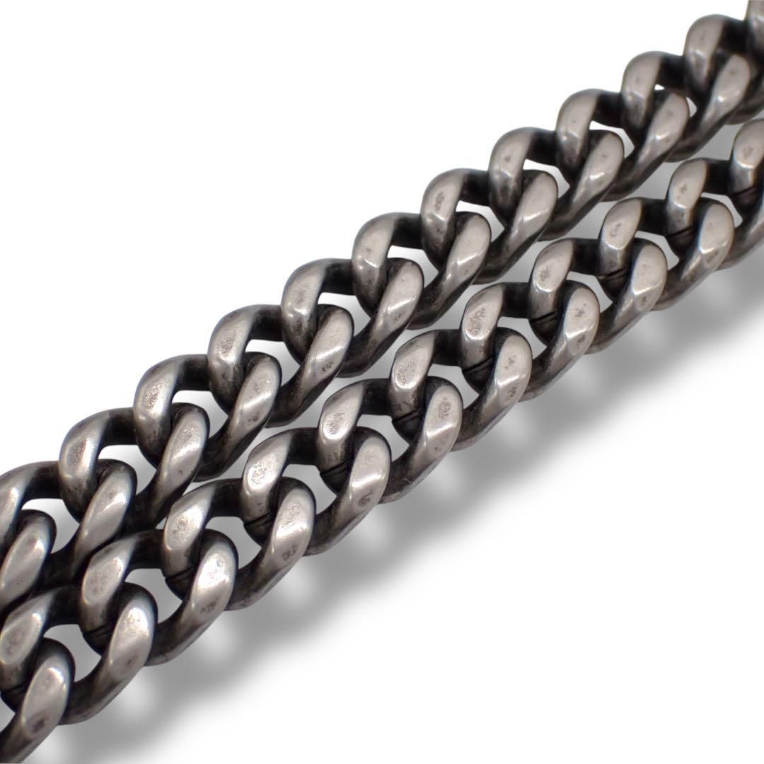 迫力のある極太9.5mm幅、そして80cmのロング仕様で抜群の存在感を誇るチェーンネックレス。燻し風の黒ずみ加工が無骨さを強調し、ストリート感たっぷり。