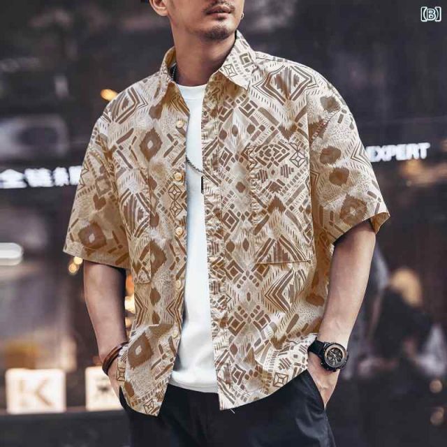 商品名:[4XL 合 210-230]メンズ ファッション 服 男性用 オシャレ シンプル 大人 かっこいい 大きいサイズ ストリート 紳士服 グリーン ハイエンド レトロ エスニック プリント 半袖 シャツ 夏 コットン カジュアル ワークシャツ