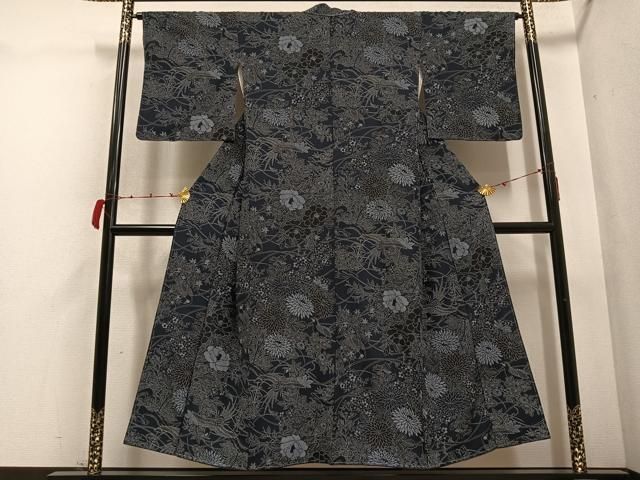 平和屋着物 上質な小紋 藍 花鳥文 正絹 ph
