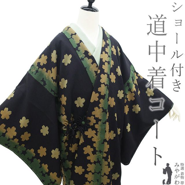 道中着 コート 正絹 袷 金彩加工 黒 桜 シルエット ショール付き セミフォーマル ~ カジュアル 春 秋 冬 道中着コート パールトーン加工済み 仕立て上がり 身丈107 裄丈70.5 Lサイズ ハオリモノ みやがわ sb 16380