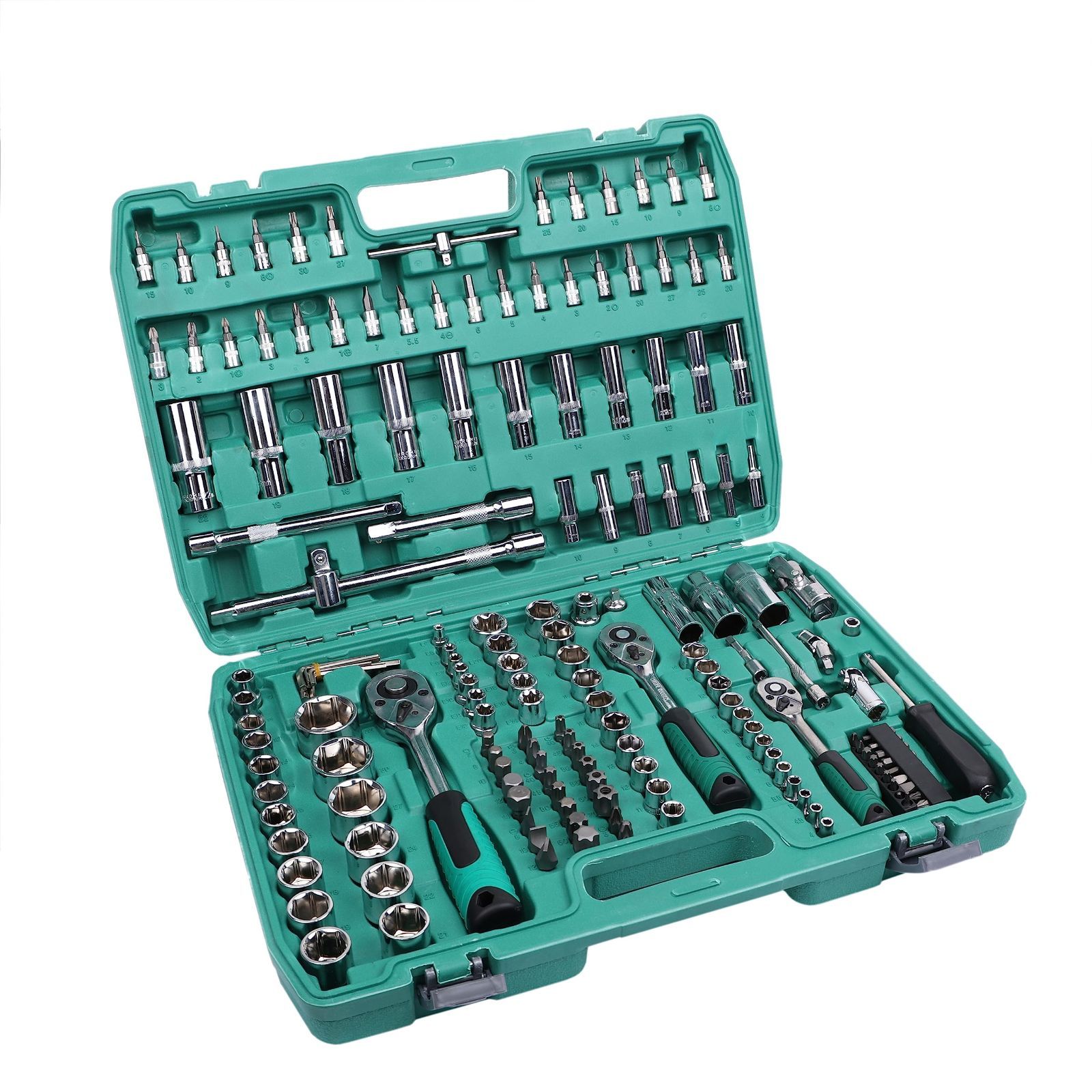 【セット内容】差込角6.3mm(1/4)、ソケットセット:4、4.5、5、5.5、6、7、8、9、10、11、12、13、14mm計13個;ディープソケット:4、5、6、7、8、9、10mm計13個;E型ソケット:E4、E5、E6、E7、E8計5個。差込角9.5mm、ソケットセット:10、11、12、13、14、15、16、17、18、19mm計10個;ディープソケット:10、11、12、13、14、15mm計6個;E型ソケット:E10、E11、E12、E14、E16、E18 計6個。差込角12.7mm、ソケットセット:10、11、12、13、14、15、16、17、18、19、20、21、22、24、27、30、32mm計17個;ディープソケット:16、17、18、19、22mm計5個;E型ソケット:E20、E24計2個。30個ソケットビット、44個ビットセット、7個六角レンチ、5個エクステンションバー、3個ラチェットハンドル、3個プラグソケット、3個ユニバーサルジョイント、1個スライドハンドル、1個スピンナーハンドル、3個弾性ポスト、1個アダプター。