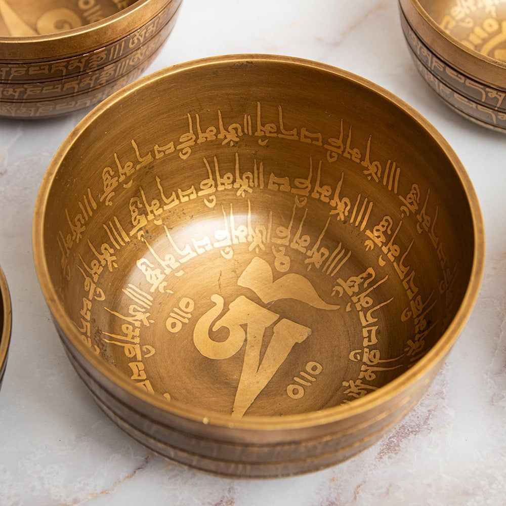 側面と内側にオンマニペメフム(真言)がエッチング装飾された非常に美しいシンギングボウルのセットが入荷しました。「オンマニペメフム(OmManiPadmeHum)」は、チベット仏教における非常に有名な真言(マントラ)です。このマントラは、観音菩薩(チベットではチェンレジー、Avalokiteshvara)のマントラであり、慈悲や悟りを象徴しています。また、「蓮華の中の宝石よ、輝け」というように解釈されることが多く、その意味でもとても美しいですね。