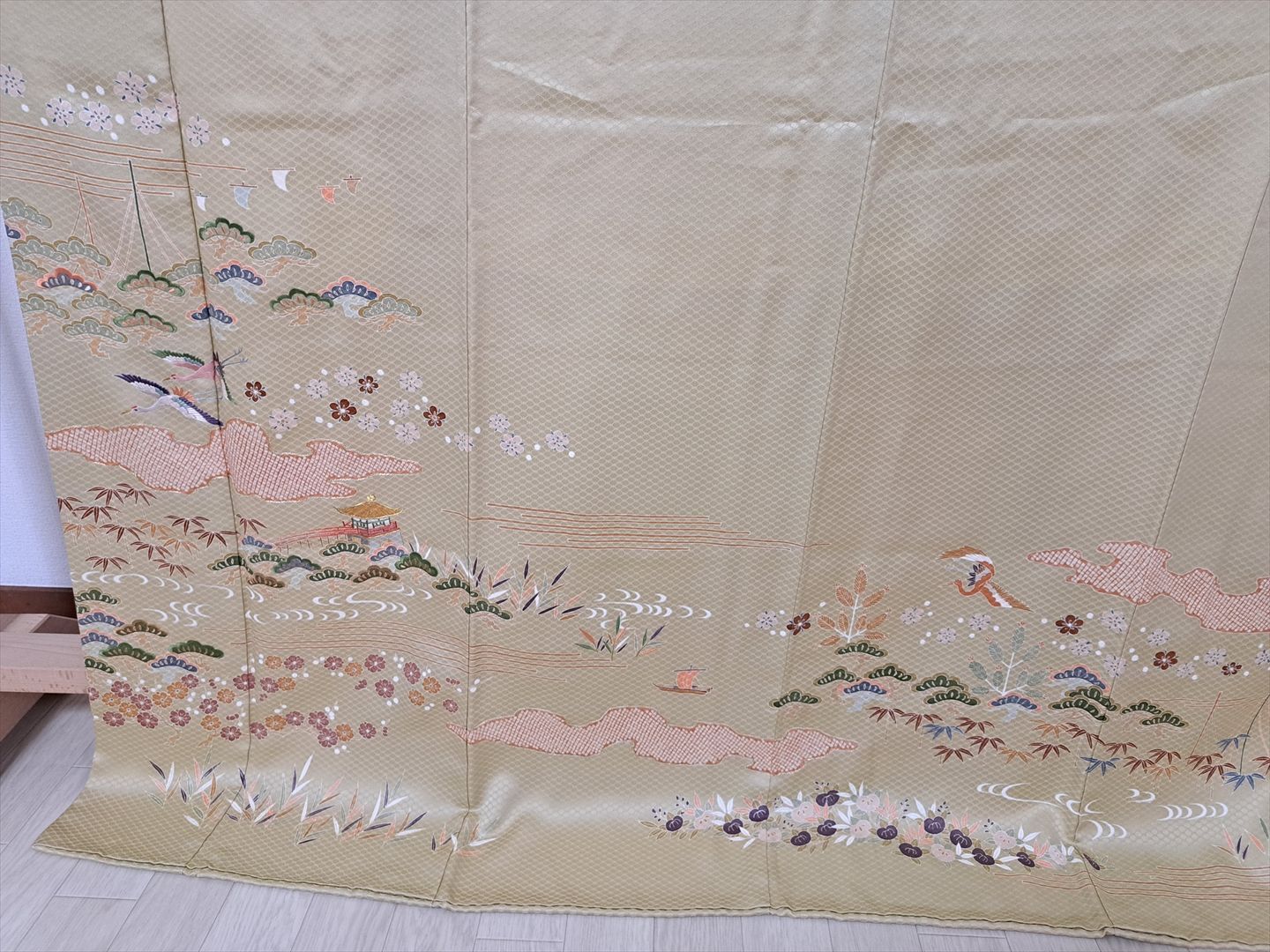 地紋入りベージュ系色地に鶴と松竹梅がデザインされた正絹・袷の色留袖です。